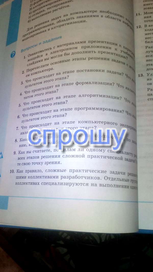 8. На мой взгляд наиболее трудоемкий этап это формализация, т.к если стоит достаточно сложная задача, гораздо труднее найти пути ее решения, чем воплотить их потом в жизнь алгоритмом или программой. Но тем не менее если задача достаточно проста в смысле определения пути решения, но требует обработки большого числа различной информации, то более трудоемким будет этап программирования.