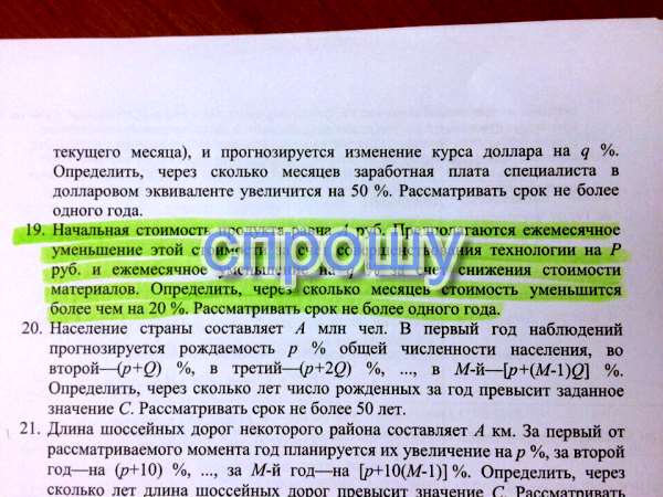 Начальная стоимость продукта равна А руб. Предполагаются ежемесячное уменьшение этой стоимости за счет совершенствования технологии на Р руб. и ежемесячное уменьшение на q % за счет снижения стоимости материалов. Определить, через сколько месяцев стоимость уменьшится более чем на 20 %. Рассматривать срок не более одного года.
