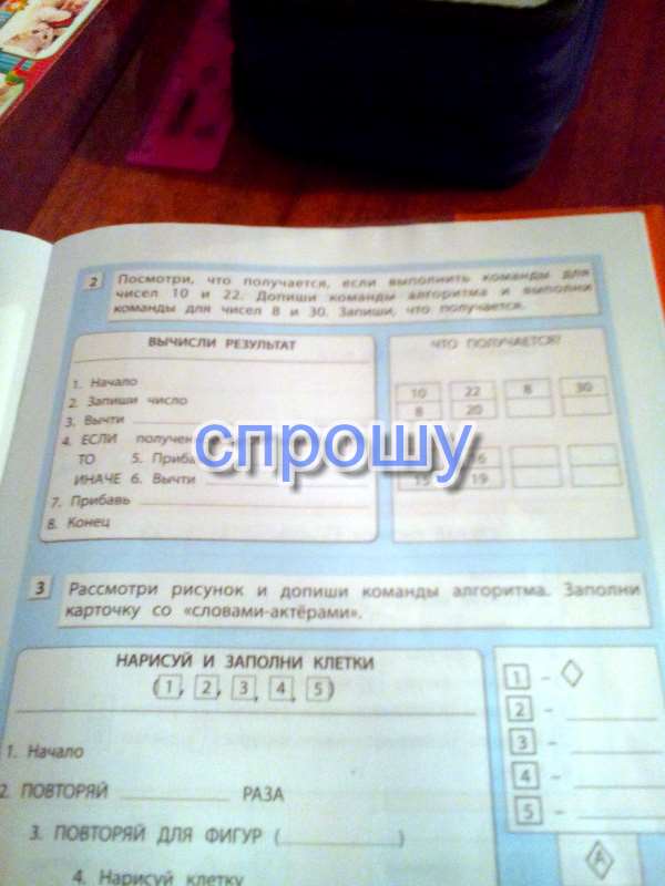 Посмотри,что получается,если выполнить команды для чисел 10 и 22.Допиши команды алгоритма и выполни команды для чисел 8 и 30.Запишт,что получается