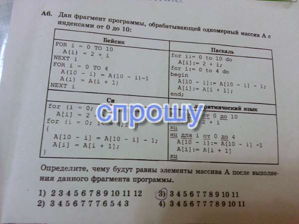 Правильный ответ 4. В первом цикле 11-ти элементам присваиваются значения от 2 до 12. Во втором первые 5 элементов увеличиваются на 1, а последние 5 - уменьшаются на 1. Итого получается: 3,4,5,6,7,7,7,8,9,10,11