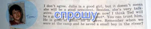 Я не согласен. Джулия хорошая девочка, но это антиплазмин означает, что она будет хорошим президентом. К тому же, она очень разговорчив. Смотри! Она переписывается даже сейчас! Я думаю, что Тед будет великим президентом. Он разведчик. Вы можете доверять ему. Он хорош в математике. Он храбр. Помните, когда мы были в лагере, и он спас маленького мальчика в реке