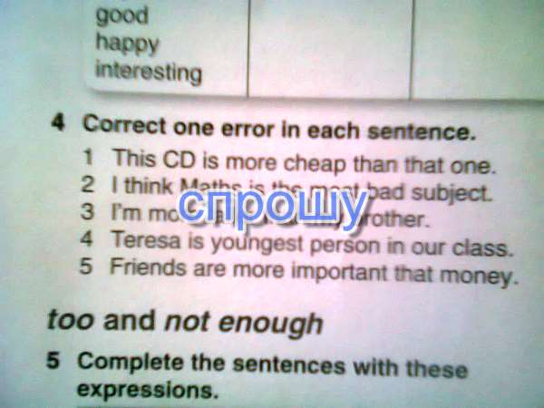 4) 1. Вместо more cheap должно быть cheaper 2. The worst вместо the most bad 3. Убрать more 4. The youngest 5. Than вместо that 6) 1. He hasnt got much money 2. She hasnt got any new clothes 3. There werent many people at the party 4. I havent got much free time 5. The teacher didnt give us any homework.