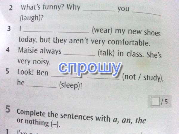 2 Whats funny Why are you laughing3. Im wearing my new shoes...4. Mary always talks...5. Look! Ben isnt studying, he is sleeping.