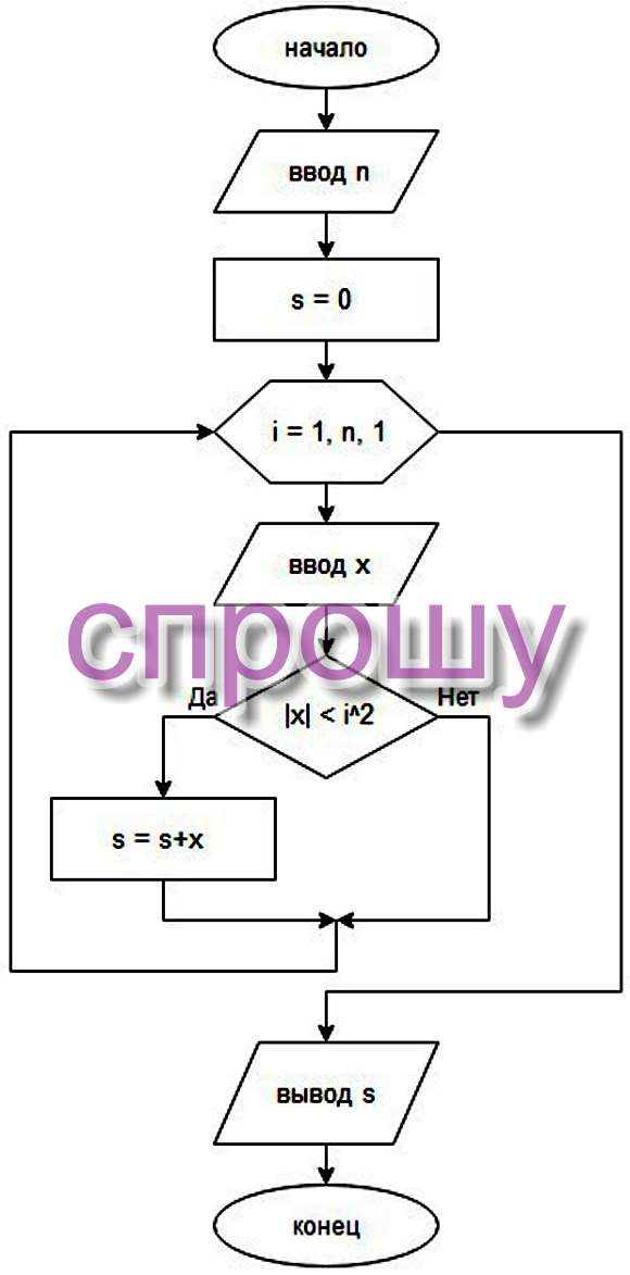 Последовательно по одному вводятся n целых чисел x, получить сумму тех чисел последовательности, которые удовлетворяют условию |xᵢ|меньше i^2.