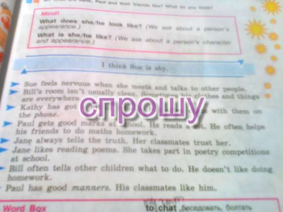 Сью чувствует себя нервничать, когда она встречает и общается с другими людьми комнате Билла обычно не elean. Sometimew его одежда и вещи "Кэти приобрела много друзей. Она часто болтает с ними на Павла получает хорошие оценки в школе. Он много читает. Он часто belps своих друзей, чтобы сделать математику домашнее задание. Пер всегда говорит правду. Ее одноклассники ей доверять. ане любит читать стихи. Она принимает участие в конкурсах поэзии школы. Л.Л. часто говорит другим детям, что делать. Он не любит делать уль имеет хорошие манеры. его elassmates, как он