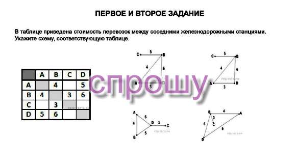 В таблице на пересечение столбца B и строки A, стоит цифра 4. Сбоку проверяет отрезки BA, он должен быть равен 4. Все подходят.Остальные аналогично проверяем . Столбец D пересекает строчку A, в данной клеточке число 5. DA=5; BC=3; BD=6; ищем сбоку рисунок у которого отрезки равны этим величинам.