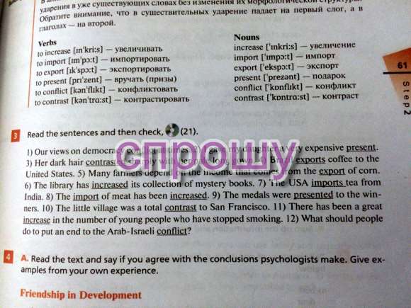 1. Наши взгляды на демократию порой конфликтуют между собой. 2. Я подарил своей дочери очень дорогой подарок. 3. Ее темные волосы резко контрастировали с ее бледным длинным платьем. 4. Бразилия экспортирует кофе в Соединенные штаты. 5. Многие фермеры зависят от дохода от экспорта кукурузы. 6. Библиотека пополнила свою коллекцию книг о тайнах. 7. США импортирует чай из Индии. 8. Импорт мяса увеличился. 9. Медали были преподнесены победителям. 10. Маленькая деревушка была полной противоположностью Сан-Франциско. 11. В последнее время произошло значительное увеличение числа молодежи, бросившей курение. 12. Что нужно делать людям, чтобы положить конец Арабо-Израильсклму конфликту