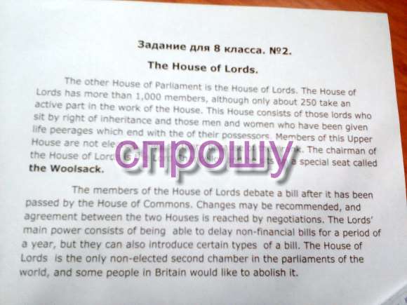 Перевод не очень точный но суть думаю понять сможешь 3anaHne 8 KAacca. N92. Дом господ. Лорды Другой Дом Парламента является Палата лордов. Дом насчитывает более 1000 членов, хотя только 250 из них принимают активное участие в работе палаты. Этот дом состоит из тех господ, которые сидят по праву наследования и тех мужчин и женщин, которые были даны IFE пэрства, заканчивающиеся их членов этой верхней палаты не избираются. Они там из-за их ранга. Председатель он Палата лордов лорд-канцлер и он сидит на специальном Калье сиденье он мешок с шерстью. Члены Палаты лордов обсудить законопроект после того, как он был оценочный Палатой общин. Изменения могут быть рекомендованы, и пылевом между двумя палатами достигнуто путем переговоров, Лорды Айн сила состоит в возможности отсрочить нефинансовые счета за год периода, но они также могут ввести определенные типы законопроекта. Дом РДС является единственным неизбираемыми второй камеры в парламентах в ДДС, и некоторые люди в Великобритании хотели бы отменить его. 3AKPblTb