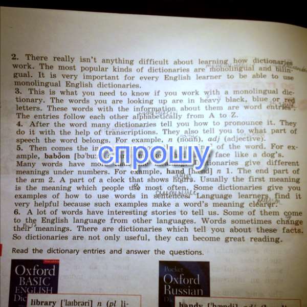 Естькак словариНаиболее популярными видами словарейгуаль это очень важно для каждого человека, изучающего английскийвозможностьиспользоватьтолковые английские словари.Это то, что вам нужно знать, если вы работаете с одноязычными умереть-слова, которые вы ищете, находятся в тяжелом черный, синийЭти словас информацией о них словарных статей.Записи следуйте едятПосле словасделать это с помощью транскрипции. Они также сказать вам, что частьречи это слово относится. Например, N (существительное) объявление) (прилагательное)Затем идет информация о значении слова. Для бывшихдостаточно, бабуин (быть Колобок) большая обезьяна, что лицо, как у собаки.Многие слова имеют более чем одно значение. Словари дают разныеНГС под номерами. Например, рука (руки) н 1 В конце частьв агттЧасть часы, которые показывают Хорс. Обычно первое значениеМинг, который люди чаще всего используют, некоторые словари дают вамСлова в senteyces изучающих Язык, найти егоочень полезно, потому что таких примеров составь слова это смысл яснееМного слов есть интересные истории, чтобы сказать нам. Некоторые из них приходятв английский язык из других языков. Слова иногда меняютТак что словари не только полезны, они могут стать великими чтения.Прочитайте словарные статьи и ответить на вопросы