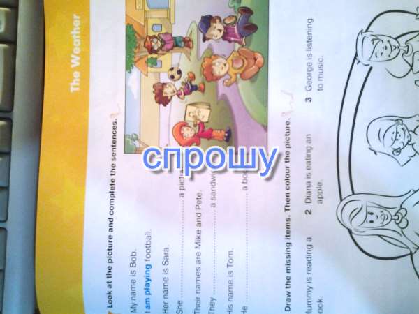 Look at the picture and complete the sentences.1)my name is Bob.I am playing football.2)Her name is Sara.