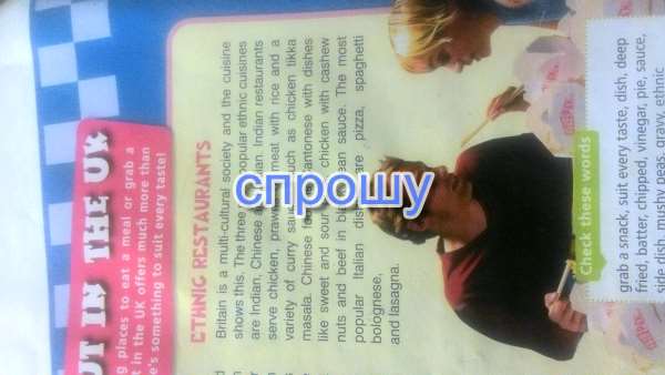 ЭТНИЧЕСКИЕ ресторанам. Великобритания является многонациональное общество и кухня показывает это. Три наиболее популярных этнических кухонь индийской, китайской и итальянской. Индийские рестораны подают курицу, креветки или мясо с рисом и разнообразные соусы карри, таких как курица тикка масала. Китайская пища кантонском с блюда, как сладкий и кислый свинина, курица с кешью и говядины в соусе из черной фасоли. Самые популярные итальянские блюда пиццы спагетти болоньезе, и лазанья.