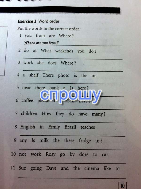 What do you do at weekendsWhere does she workThere is a shelf on the photoIs there here near a bankCan I have a coffe pleaseHow they children have many doEmily teaches English in BrazilIs there any fridge in the milkRosw does not go to work by carDave and Sue like going to the cinema