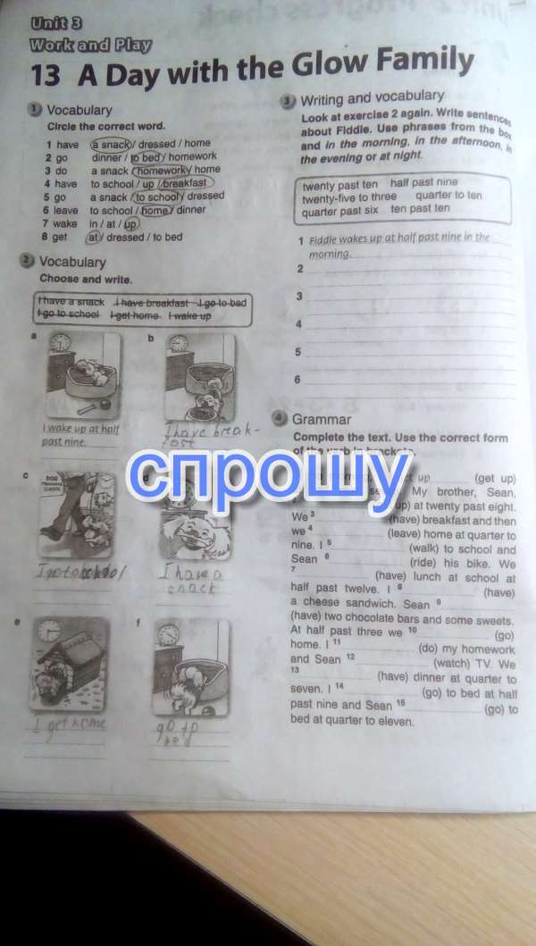 4. get up, have, leave, walk, rides, have, have, has, go, do, watches, have, go, goes. 2. 2.at guarter to ten, at ten past ten, at twenty-five to three, at guarter past six, at twenty past ten. 3. 2. Fiddle have breakfast at quarter to ten, Fiddle go to school at ten past ten, Fiddle have snack at twenty-five to three, Fiddle go home at quarter past six, Fiddle go to bed at twenty past ten.