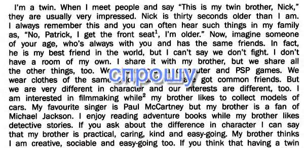 они обычно очень впечатлены. Ник старше меня на 30 секунд. Я всегда вспоминаю это и вы можете часто слышать такие вещи в моей семье как, "Нет, Патрик, Я займу переднее сиденье, Я старше.". Теперь представьте кого-то в твоём возрасте, кто всегда и у вас одинаковые друзья. По факту он мой самый лучший друг в мире, но я не могу сказать, что мы не дерёмся. У меня нет собственной комнаты, Я делю её со своим братом, но мы делим и другие вещи тоже. Мы делим игрушки, комп и игры для PSP. Мы носим одежду одинакового цвета и у нас общие друзья. Но мы очень разные по характеру и по интересам тоже. Я интересуюсь созданием кинофильмов, пока мой брат любит собирать модели автомобилей. Мой любимый певец-это Пол МакКартни, но мой брат фанат Майкла Джексона. Я наслаждаюсь чтением приключенческих книг, пока мой брат любит детективы. Если вы спросите про различия в характере, то я могу сказать, что мой брат практичный, заботливый, добрый и беззаботный. Мой брат думает, что я творческий, социальный, и тоже легкомысленный. Если вы думаете, что наличие брата-близнеца может очень сильно помочь в школе, то вы ошибаетесь, так как учителя хорошо знают всё насчет "близняшко-трюков". И мы с братом учимся настолько упорно, насколько можем. Я хорош в Математике, Географии и Истории, а мой брат хорош в Английском, Французском и Литературе. Так что, мы можем помогать друг другу во многом. По факту мы не забываем, мы близнецы и очень сильно заботимся друг о друге. Мой брат-близнец будет давать мне хорошие советы, потому что он меня знает лучше, чем кто-либо другой в мире.