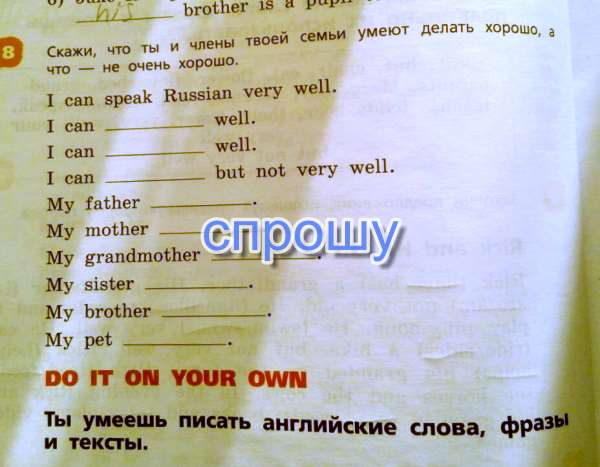 I can see very well. I can swim very well. I can draw but not very well. My father can eat very well. My mother can cook very well. My grandmother can read very well. My sister can sing very well. My brother can play computer games but not very well. My pet can fly.