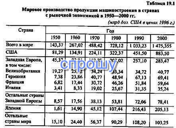 В целом мировое производство продукции машиностроения характеризовалось во второй половине XX в. следующими данными (табл. 19.1).
