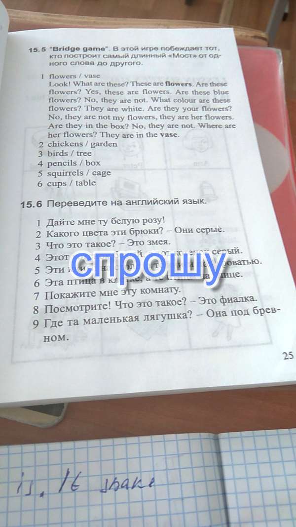 1.Give me that white rose!2. What color are these pants-They are gray.3.What is it-It was a snake.4. This kitten is white,and one grey kitten.5. These books are on the table,and those books under the bed.6.The bird in the cage and those birds on the street.7.Show me this room.8. Look!What is it -Its a violet.9. Where is little frog-Its under a log