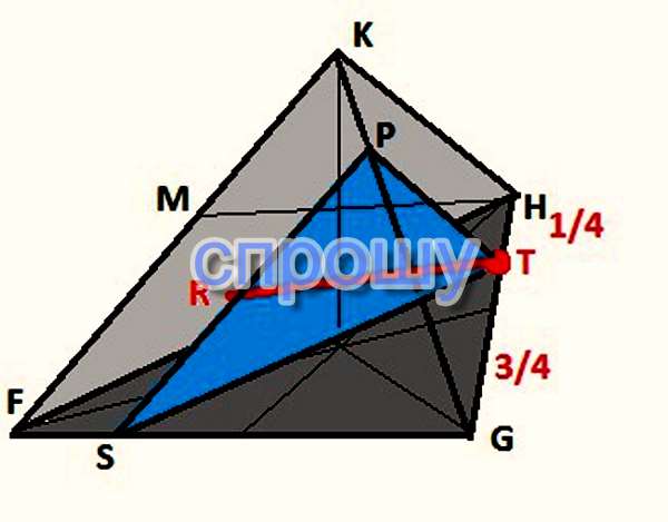 На ребре GH треугольной пирамиды FGHK с равными друг другу ребрами выбрана такая точка T, что HT:TG = 1:3, и через нее проведена прямая h , параллельна медиане HM боковой грани KHF и пересекающая поверхность пирамиды в точке R. найдите ребро пирамиды, учитывая, что TR = 6см