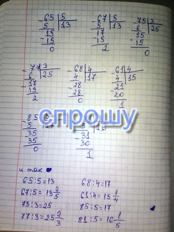 Помогите пожалуйста решить столбиком 65:5 67:5 75:3 77:3 68:4 61:4 85:5 81:5
