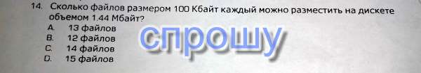 СКОЛЬКО ФАЙЛОВ РАЗМЕРОМ 100 КБАЙТ, КАЖДЫЙ МОЖНО РАЗМЕСТИТЬ НА ДИСКЕТЕ ОБЪЕМОМ 1.44МБАЙТ?! ОТВЕТ ДОЛЖЕН ПОЛУЧИТЬСЯ ОДИН ИЗ ЭТОГО:A/13ФАЙЛОВ.B/12ФАЙЛОВ.С/14 ФАЙЛОВ.?! ПОМОГИТЕ ПОЖАЛУЙСТА,АТО ПУТОННИЦА У МЕНЯ КАКАЯ-ТО(.........ВАРИАНТ D/ НЕ РАССМАТРИВАЙТЕ! ОН НЕ ПРАВИЛЬНЫЙ