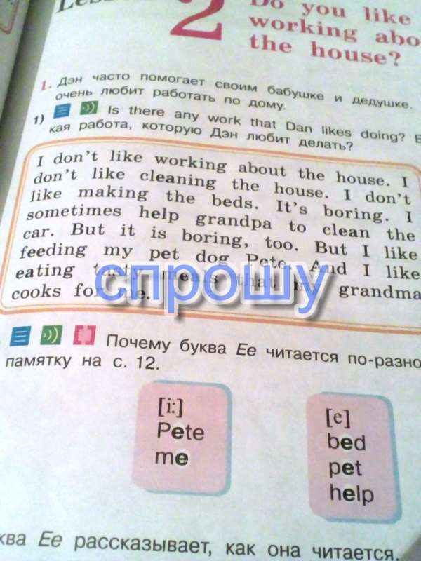 Я не люблю работать дома. Я не люблю убираться дома. Я не люблю заправлять кровать. Иногда я помогаю дедушке мыть машину. Но это скучно. Но я люблю кормить мою собаку Пита. И я люблю кушать вкусную еду которую моя бабушка приготовила для меня.