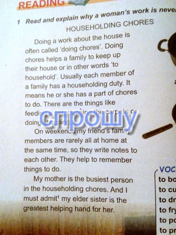 Выполнение работы по дому часто называют делая хозяйственные работы. Делая работу по дому помогает семье сохранить свой дом или другими словами к Обычно каждый член семьи имеет предметы домашнего Это означает, что он или она имеет часть хозяйственных работ, чтобы сделать. Есть вещи, как кормление домашних животных, чистка ковров или делать покупки ... В выходные члены семьи моего друга редко все дома в то же время, так что они пишут друг другу записки. Они помогают запоминать вещи делать. Моя мать является самым загруженным человеком в предметы домашнего делами. И я должен признать, моя старшая сестра является самой большой протянуть руку помощи для нее.