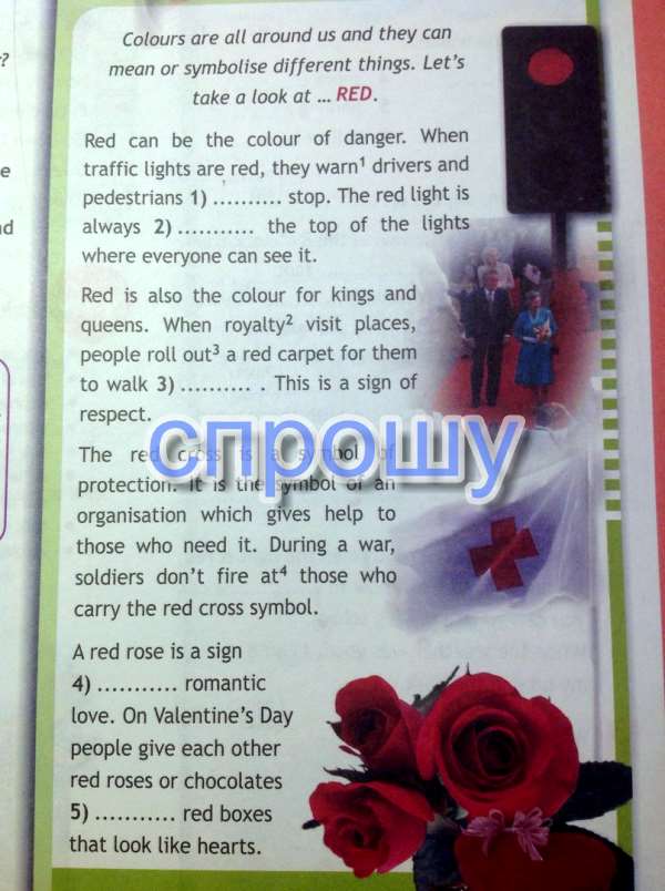 Красный может быть цвет опасности. Когда светофор красный, они предупреждают водителей и пешеходов 1) остановки. Красный свет всегда 2) ........... верх огней, где каждый может увидеть его. Красный цвет также цвет для королей и королев. Когда royalty2 посещать места, люди катиться out3 красный ковер для них, чтобы ходить 3) .......... Это знак уважения красного креста является символом защиты. Это символ организации, которая оказывает помощь тем, кто в ней нуждается. Во время войны, солдаты не стрелять в тех, кто носит красный крест символ. Красная роза знак 4) ........... романтическая любовь. На День святого Валентина люди дарят друг другу красные розы или шоколад 5) ........... красные коробки, которые выглядят как сердца.