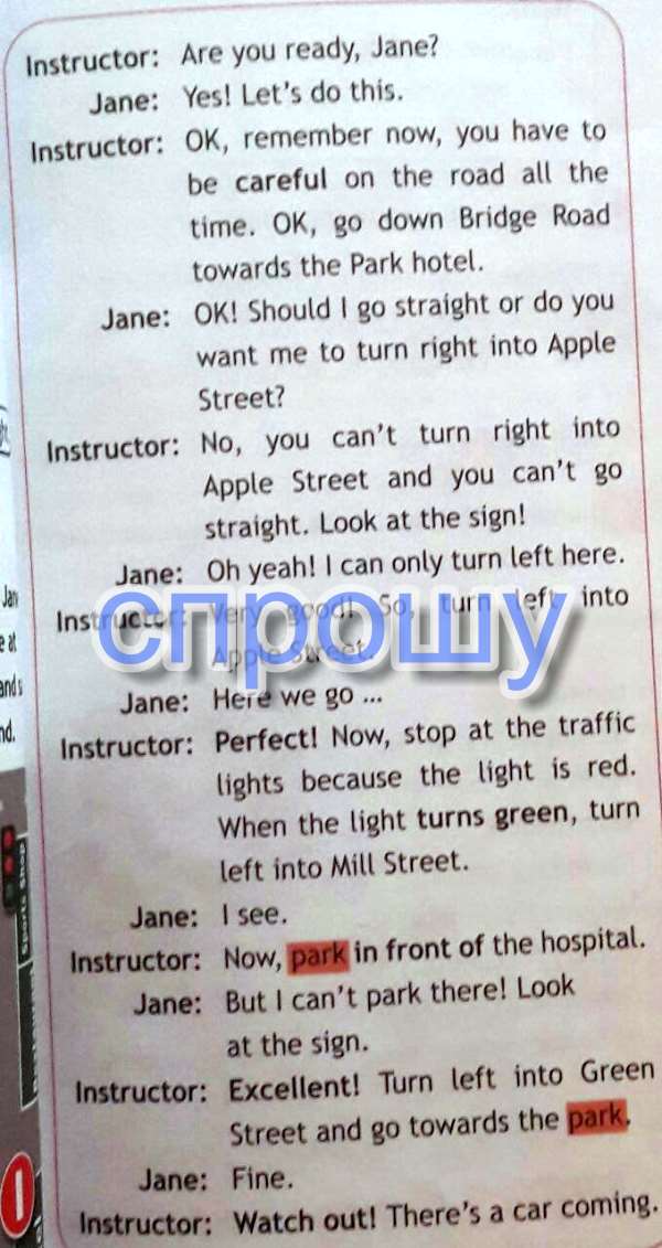 Преподаватель: Вы готовы, Джейн Джейн: Да! Давай сделаем это. Преподаватель: Хорошо, помню сейчас, вы должны быть осторожными на дороге все время. Ладно, иди вниз Bridge Road в сторону отеля Park. Джейн: OK! Должен ли я идти прямо или вы хотите, чтобы я повернуть направо на Apple, стрит Преподаватель: Нет, вы не можете повернуть направо на улице Apple, и вы не можете идти прямо. Посмотрите на знак! Джейн: о да! только может повернуть здесь налево. Преподаватель: Очень хорошо! Так, повернуть налево на Apple, ул. Джейн: Здесь мы идем Инструктор: Отлично! Теперь, останавливаются на светофоре, так как красный свет. Когда загорится зеленый, повернуть налево на Милл-стрит. Джейн: Я вижу. Инструктор: Теперь, парк перед больницы. Джейн: Но не могу оставить там! Посмотрите на знак. Инструктор: Отлично! Поверните налево на Грин-стрит, и идти в сторону парка. Джейн: Хорошо. Инструктор: берегись! Там есть автомобиль ближайшие.
