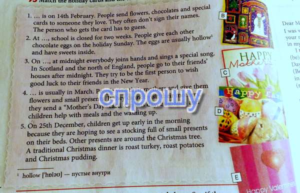 1. День Валентина отмечается 14 февраля. Люди дарят цветы, шоколадки и специльные открытки тем, кого они любят. Чаще всего они не подписывают их. Человек который получил открытку должен угадать от кого она (от себя добавил).