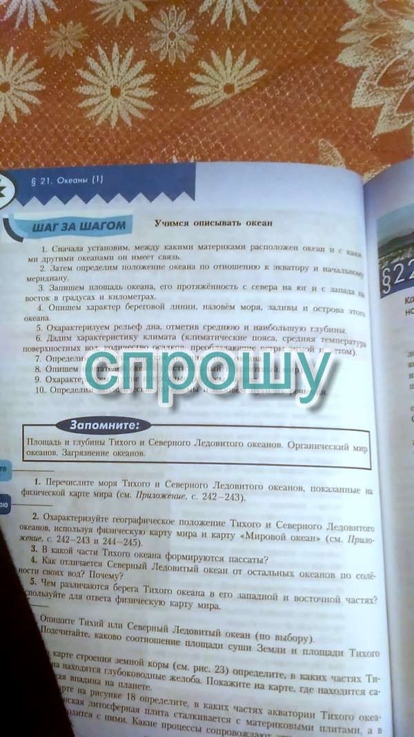 1) Тихий окена расположен между Евразией, Австралией, Северной Америкой, Южной Америкой и Антарктидой. Связан с Атлантическим, Индийским и Северным Ледовитым океанами.