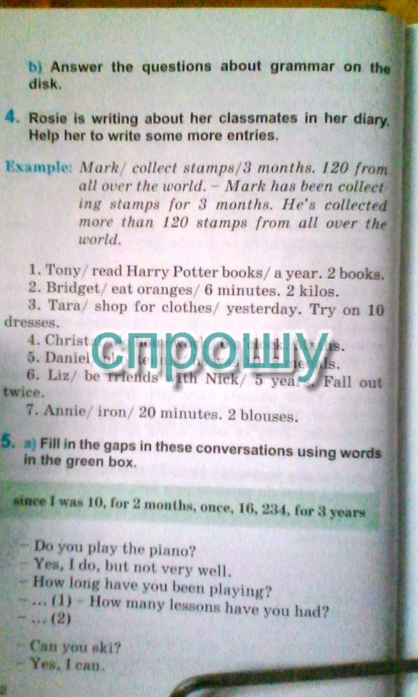 1. Tony has been reading Harry Potter books for year. He has read 2 books. 2. Bridget has been eating oranges for 6 minutes. She has eaten 2 kilos.