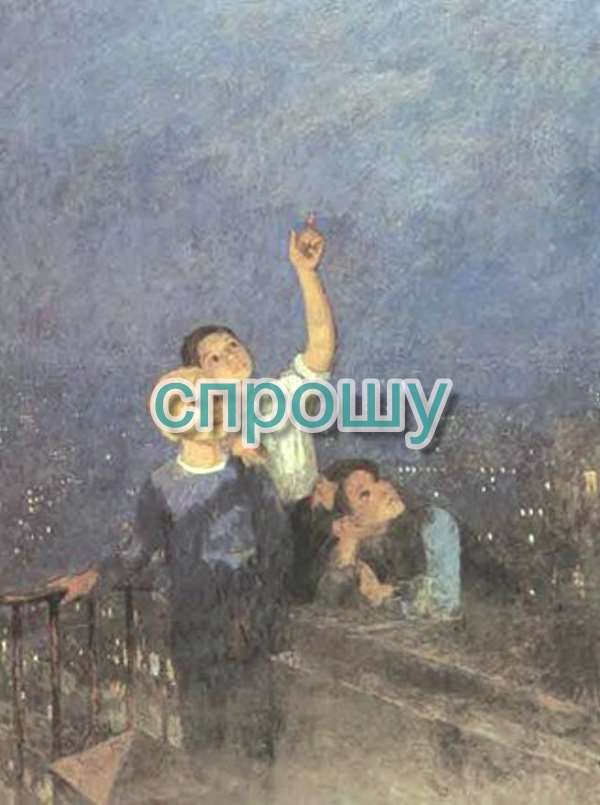 В данный момент мальчиков кроме неба и звезд ничего не интересует, их окружает красивый ночной город, но они не смотрят на него. Мальчики так увлечены небом, что их не пугает высота, на которой они находятся, а ведь они стоят прямо у края крыши. А между тем горящие окна напоминают сверкающие звезды в небе, а сине-черное небо кажется космическим пространством.