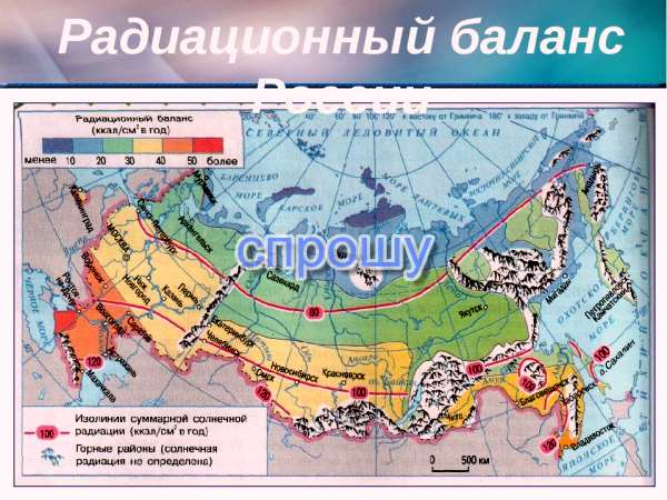 Исходя из показаний карты,которая дана ниже в приложении,можно установить,что суммарная солнечная радиация в южных районах в два раза больше,чем в северных;а радиационный баланс в южных районах больше в 3-4 раза,чем в северных.