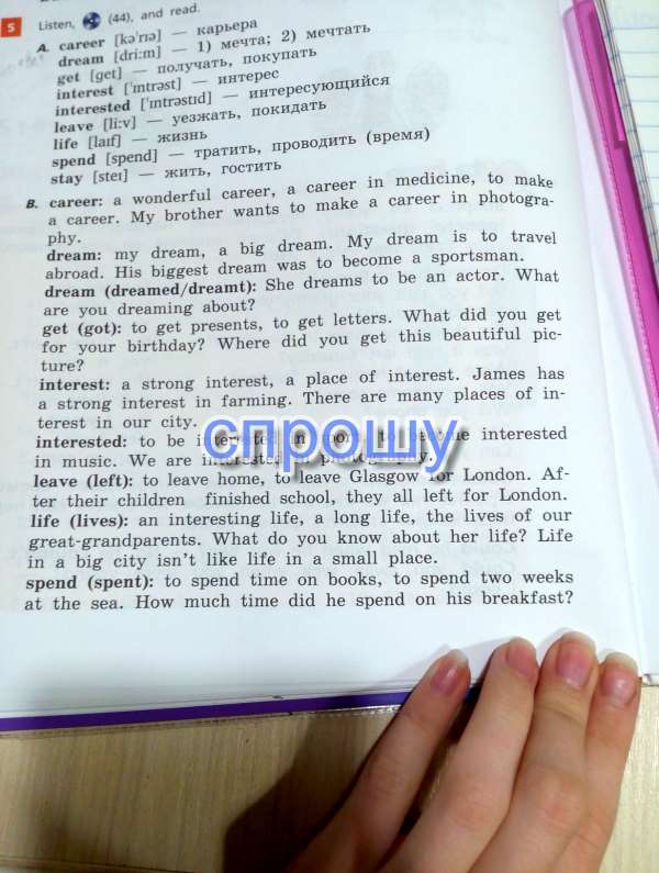 Карьера Мой брат хочет сделать карьеру в photogra- PHY во сне: моя мечта, большая мечта. Моя мечта путешествовать за границу. Его самая большая мечта была стать спортсменом актер. Какие вы мечтаете получить (есть), чтобы получить подарки, чтобы получить письма. Что ты получил для TURE Интерес: сильный интерес, место интереса. Джеймс имеет сильный интерес в сельском хозяйстве. Есть много мест, инве- нашего интереса нашем городе. заинтересованы: чтобы быть заинтересованы в спорте, чтобы стать заинтересованы Музыка. заинтересованы в фотографии. оставить (слева), чтобы выйти из дома, чтобы оставить Глазго в Лондон Терр своих детей жизнь (жизнь) интересная жизнь, долгую жизнь, жизнь наших прабабушка и прадедушка. Что вы знаете о своей жизни жизнь в большом городе не похожа на жизнь небольшое место. на книги, чтобы провести две недели в море. Сколько времени он потратит на свой завтрак