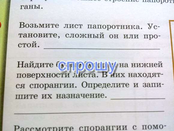 Лист сложный.в спорангиях находятся споры, когда споры созревают,спорангии разрываются и споры падают на землю, после чего происходит размножение.