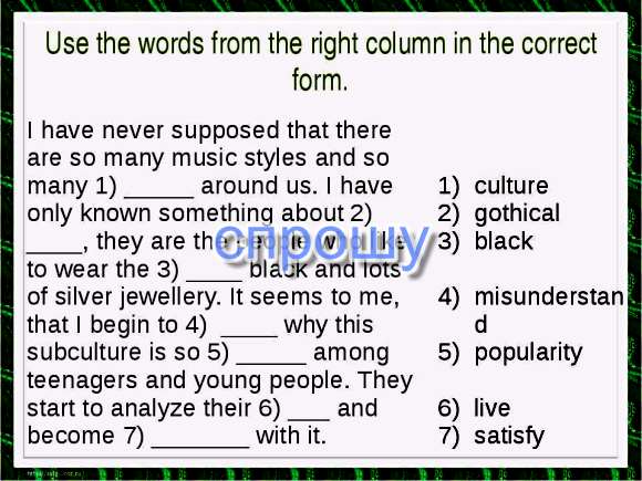 Я никогда не предполагал,что существует там много музыкальных стилей и так много культур вокруг нас.Я знал только кое что о готах,они люди которые любят носить чёрный и много серебряных украшений.Мне кажется,я начинаю понимать почему эта субкультура так популярна среди подростков и молодых людей.Они начинают анализировать свою жизнь и становятся недовольны ею.