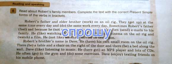 Отец и старший брат Роберта работают на нефтяной вышке. Они просыпаются в одно время и делают одну и ту же работу каждый день. Иногда отец Роберта чувствует себя грустно, потому что он неделями не видит свою семью. Он часто посылает электронные письма своей семье. Ему нравится смотреть фильмы. Он ходит в маленький кинотеатр на нефтяной вышке и смотрит фильм. Ему не нравится смотреть фильмы по телевизору.Брата Роберта зовут Дейв. У него есть своя собственная маленькая комната на нефтяной вышке. В ней есть стол и стул справа от двери и кровать вдоль стены. Дейв любит слушать музыку. У него есть MP3 плеер и много дисков. Он часто ходит в спортзал и делает упражнения. Ему нравится писать своим друзьям через мобильный телефон.