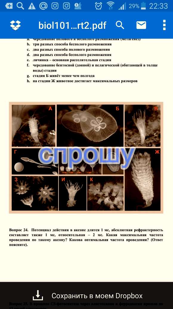 После полного и равномерного дробления яйца образуется бластула, а затем типичная мерцательная планула. Она сначала плавает, позднее же прикрепляется передним полюсом к морскому дну. На прежнем заднем, а теперь верхнем полюсе прорывается рот, который ведет внутрь образующейся к этому времени гастральной полости. Вокруг рта развивается венчик щупалец, число которых кратно четырем. Энтодерма гастральной полости дает 4 продольных желудочных валика. В результате этих изменений планула превращается в маленького одиночного полипа - сцифистому (рис. 108 ), немного похожего на гидру, но устроенного сложнее. Этот полип может путем почкования давать начало другим сцифистомам.