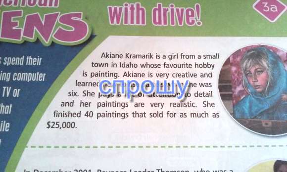 Акейн Крамарик девочка из маленького города Идахо любимое хобби которой это рисовать. Акейн очень креативная и знает как пользоваться пастелью с 6 лет. Oна уделяет много времени деталям и ее картины очень реалистичные. Она закончила 40 картин и продала их больше чем за 25 тысяч долларов.