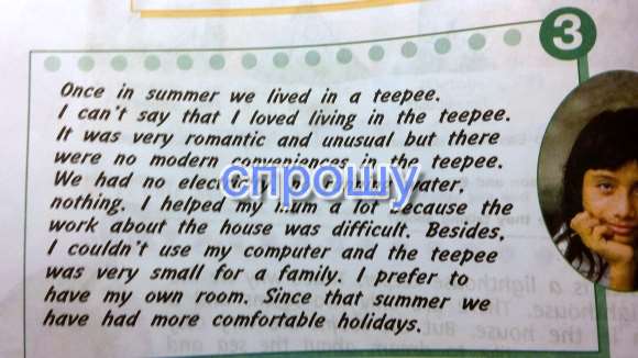 Как-то летом мы жили в вигваме (палатке/шалаше). Я не могу сказать, что мне нравилось жить в вигваме. Это было романтично и необычно, но там не было (никаких) современных удобств. У нас не было ни электричества, ни водопровода, ничего. Я много помогал своей маме, потому что вести хозяйство было тяжело. Кроме того, я не мог пользоваться компьютером, и вигвам был слишком (очень) маленький для (целой) семьи. Я предпочитаю иметь свою собственную комнату. С того самого лета (после того лета) мы проводили наши каникулы (выходные / отпуск) в более комфортных условиях.