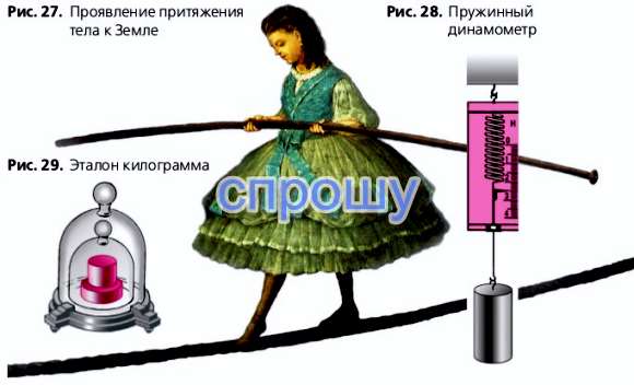 На груз, помещенный посередине металлической линейки или троса, и на груз, подвешенный при помощи нити на крючок пружинного динамометра, тоже действует сила притяжения Земли. В первом случае груз давит на опору и прогибает ее (рис. 27), во втором натягивает нить и растягивает пружину динамометра (рис. 28).