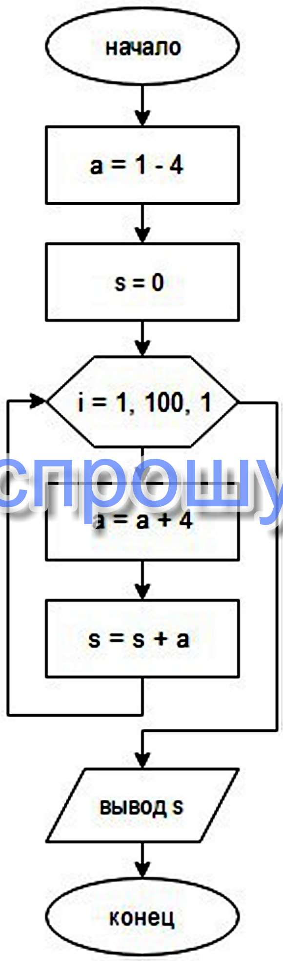 СРОЧНО!!!! Составьте блок-схему и алгоритм к задаче. Найти сумму 100 чисел последовательности 1,5,9,13,17,....