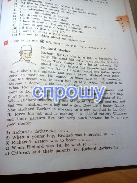 Когда Ричарду было восемнадцать, он оставил свой дом ради учебы в Лондоне и уехал в Лондонский Университет. Годы, проведенные в университете, были лучшими в его жизни. Он делал то, что ему нравилось и получал от этого удовольствие. Когда Ричарду было двадцать шесть, он встретил Маргарет. Они поженились и у них родились двое детей - мальчик и девочка. Они счастливая семья. Сейчас Ричард Баркер работает в новой больнице в Лондоне. Он любит свою работу и делает замечательную карьеру. Дети и их родители очень любят его, потому что он очень хороший врач.