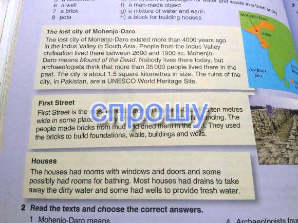 Потерянный город Мохенджо-Даро потерянной существовал город Мохенджо-Даро OT более 4000 лет назад в долине Инда в Южной Азии Люди TROM цивилизации долины Инда жили там в период между 2000 и 1900 годами до н. Мохенджо. Даро означает курган мертвых. Никто не живет там сегодня, но археологи думают, что более чем 35000 человек жили там в прошлом Аравии. В городе составляет около 1,5 квадратных километров. Руины Ot города, в Пакистане, являются объектом Всемирного наследия ЮНЕСКО. Первая улица Первая улица самая известная улица в Мохенджо-Даро, это широкие в некоторых местах десять метров. Многие из стен дома все еще стоят. Народ сделал кирпичи из грязи и сушат их на солнце. Они использовали кирпичи, чтобы построить фундамент, стены и колодцы. Дома Дома были комнаты с окнами и дверьми, а некоторые, возможно, были устроены комнаты для купания. Большинство домов дренажи забрать грязную воду, и некоторые из них имели колодцы, чтобы обеспечить свежую воду.