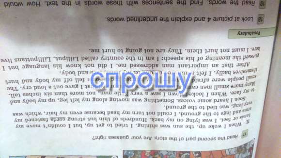 Когда я проснулся, сияло солнце. Я попытался встать, но не смог пошевелить ни руками, ни ногами. Я лежал на спине. Сотнями тонких, но крепких веревок мои руки и ноги были прикреплены к земле. Я не мог повернуть голову, потому что даже волосы, которые были очень длинными, были тоже прикреплены к земле. Вскоре я услышал какие-то голоса. Что-то передвигалось по моей левой ноге к телу, и затем к лицу. Когда я посмотрел вниз, я увидел очень маленького человечка не более 6 дюймов ростом. Много ещё маленьких людей шли за ним. Я был так удивлен, что громко вскрикнул. Маленькие люди испугались меня и отскочили назад. Некоторые упали с моего тела и сильно поранились. Я почувствовал сотню стрел на своей руке, лице и теле. После этого один важный человек обратился ко мне. Я не знал его языка, но я понял смысл его речи: я нахожусь в стране под названием Лилипутия. Там живут лилипуты. Я не должен их обижать. Они не собираются причинить мне вред.
