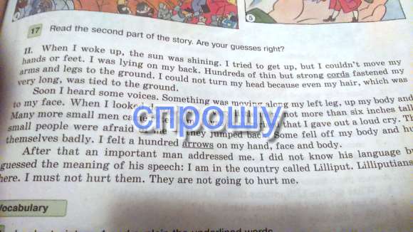 Когда я проснулся, светило солнце. Я попытался встать, но я не мог пошевелить руками или ногами, я лежал на спине, сотни тонких нитей связывали мои ноги и руки с землей, Я не мог пошевелить даже головой, так как мои волосы, которые очень длинные, были связаны с землей