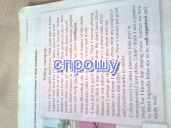 " Я была не очень хороша в математике. Потом я начала играть в шахматы. Сначало это было просто хобби. У нас нет уроков шахмат в школе , но есть клуб шахмат . После школы я всегда иду туда и играю в шахматы с моим учителем . Я дома я также играю в шахматы с моим компьютером. Иногда я играю в шахматы с папой . Сейчас я всегда получаю хорошие оценки по математике . Я часто путешествую по разным местам чтобы принимать участие в турнирах . Я люблю шахматы , я не считаю себя идеальным учеником , но я знаю что игра в шахматы помогает мне развиваться логический , быть хорошо организованной и хорошо учиться "