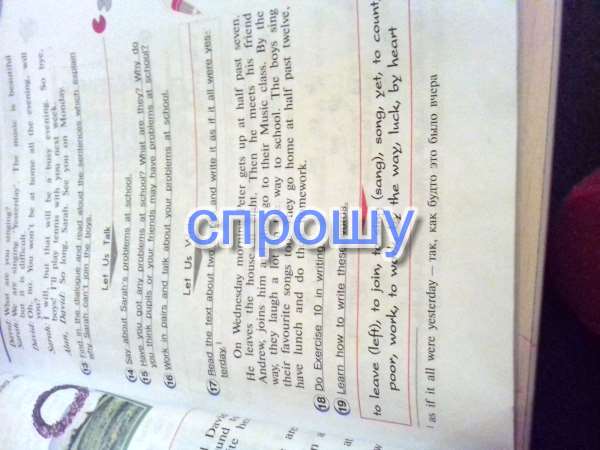 At Wednesday morning Peter got up at half past seven. He left the house at eight. Then he met his friend Andrew, joined him, and they went to their Music class. By the way they (laugh - прости, не помню вторую форму) a lot on the way to school. The boys sang their favourite songs too. They went home at half past twelve, had lunch and did their homework.