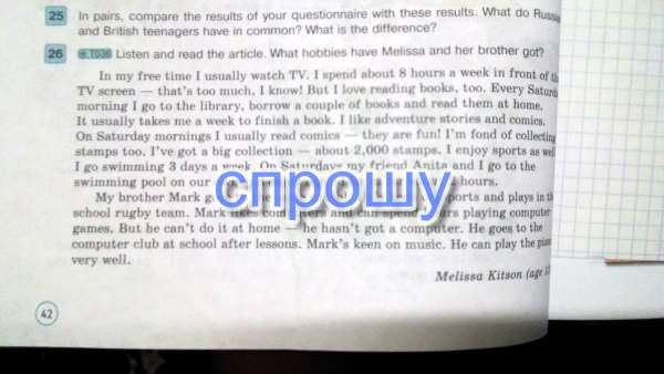 В парах, куб.и британских подростков имеют в общем Какая разницаСлушайте и читайте в статье. Какие увлечения у Мелиссы и ее брата доВ свободное оловоЭкраномслишком каждый Сатурнаутром я хожу в библиотеку. взятьпару книг и читать их дома,Обычно это занимает у меня неделя, чтобы закончить книгу. Я люблю приключенческие рассказы и комиксы.В субботу утром я обычно читаю комиксыони весело! Я люблю собирать!марки тоже. У меня есть большая коллекция - около 2000 марок. Я люблю спорт, а такжеЯ плаваю 3 раза в неделю. По субботам моя подруга Анита и я иду кбассейн на собственном и наслаждаться хорошим плаванием около 2 часов.Мой брат Марк ходит в ту же школу. Он увлекается спортом и играет вМарк любитигры. Но он не может сделать это домау него нет компьютера. Он идет кнулеваяочень хорошо.Мелиссы Китсон (возраст#