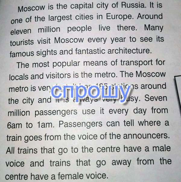 Москва является столицей России. Это один из самых больших городов в Европе. Около одиннадцати миллионов человек живут там. Много туристов посещают Москву каждый год, чтобы увидеть знаменитые достопримечательности и фантастическую архитектуру. Самым популярным средством передвижения для местных жителей и посетителей является метро. Московское метро очень быстрое. Оно имеет 185 станций по всему городу. Семь миллионов пассажиров используют его каждый день с 6 утра до 1 часа ночи. Пассажиры могут сказать, где поезд идет по голосу дикторов. Все поезда, которые идут в центр имеют мужской голос и поезда, которые идут от центра имеют женский голос.